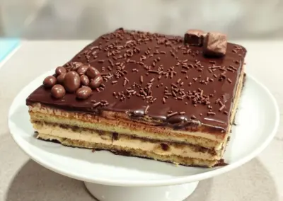 A refined masterpiece of thin almond sponge layers soaked in coffee syrup, alternated with silky chocolate ganache, rich coffee buttercream, and glossy glaze.