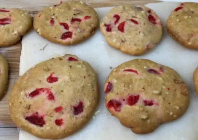Studded with maraschino cherries for subtle fruity sweetness and vibrant pink-red flecks, they offer a buttery, tender texture that's perfect for holiday displays or everyday treats.